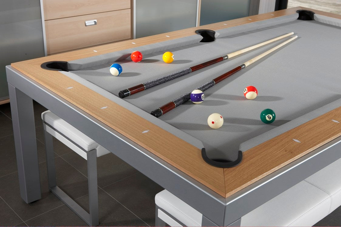 Fusiontable features an innovative lift lever mechanism that effortlessly shifts between two heights - for dine and play - transforming a dining table into a pool table in mere seconds. It does not require any specific maintenance, and is also fitted with a patented automatic two-level fastening system to ensure a stable, regular and flat playing area when the table is in a "high" position.